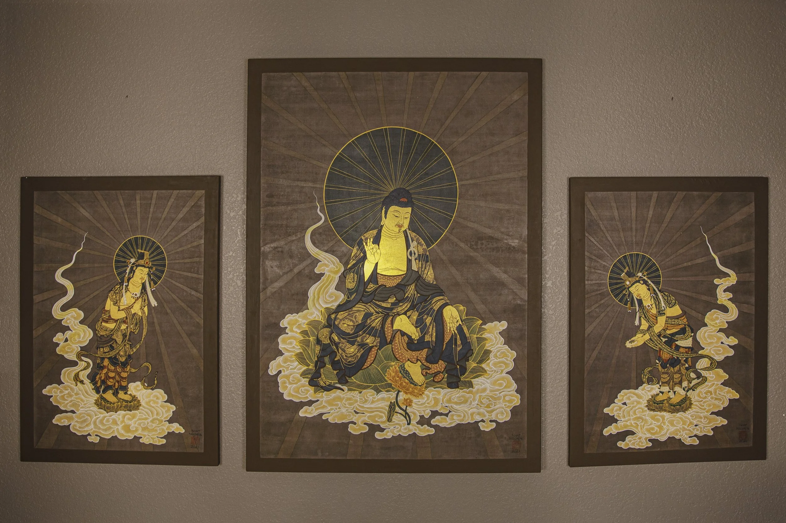 Details: This commissioned triptych depicts the scene of the rulers descending from above to welcome the souls of dyings to Amida’s pure land. The posture of each figure symbolizes their duty and vows.
