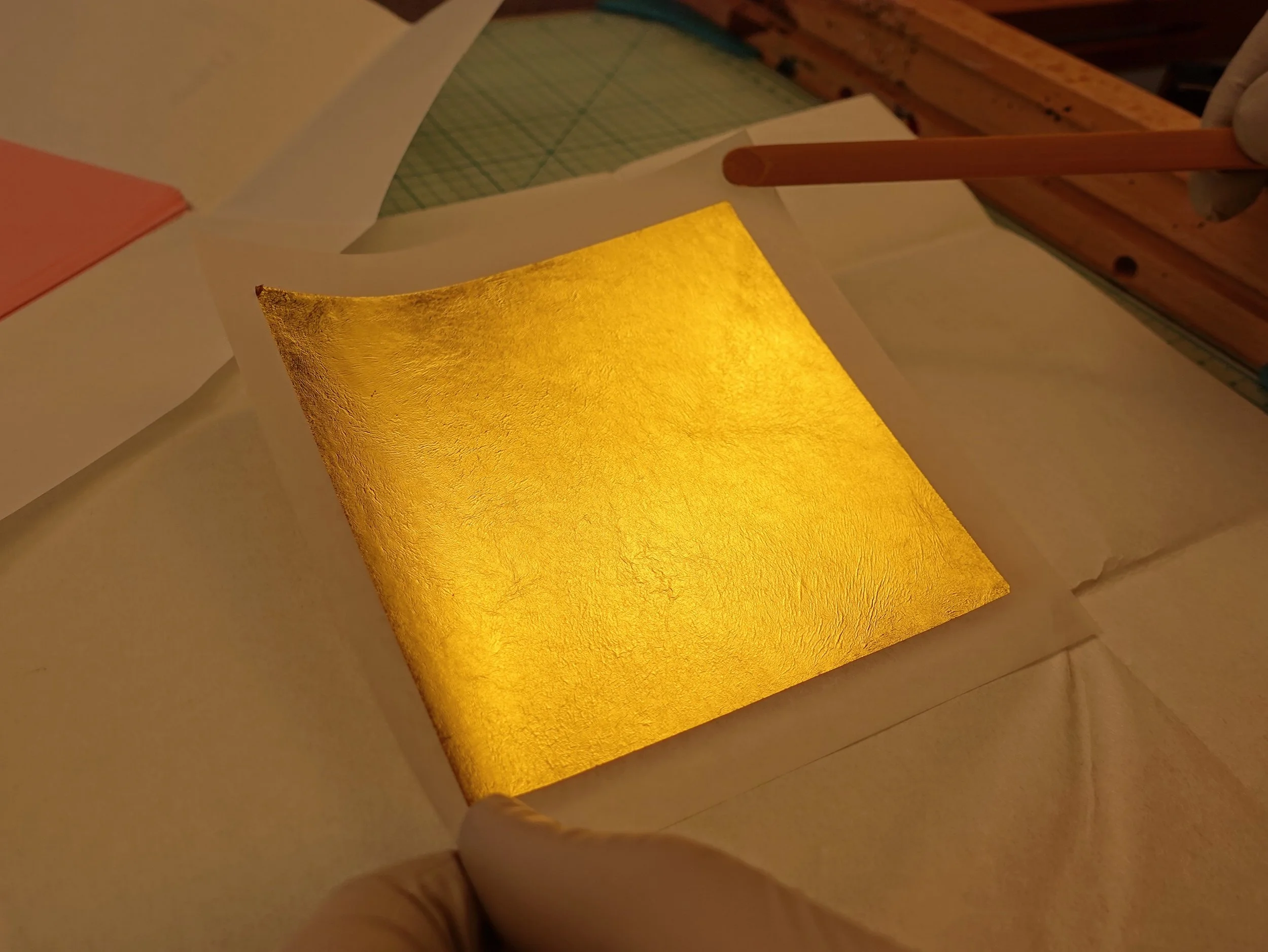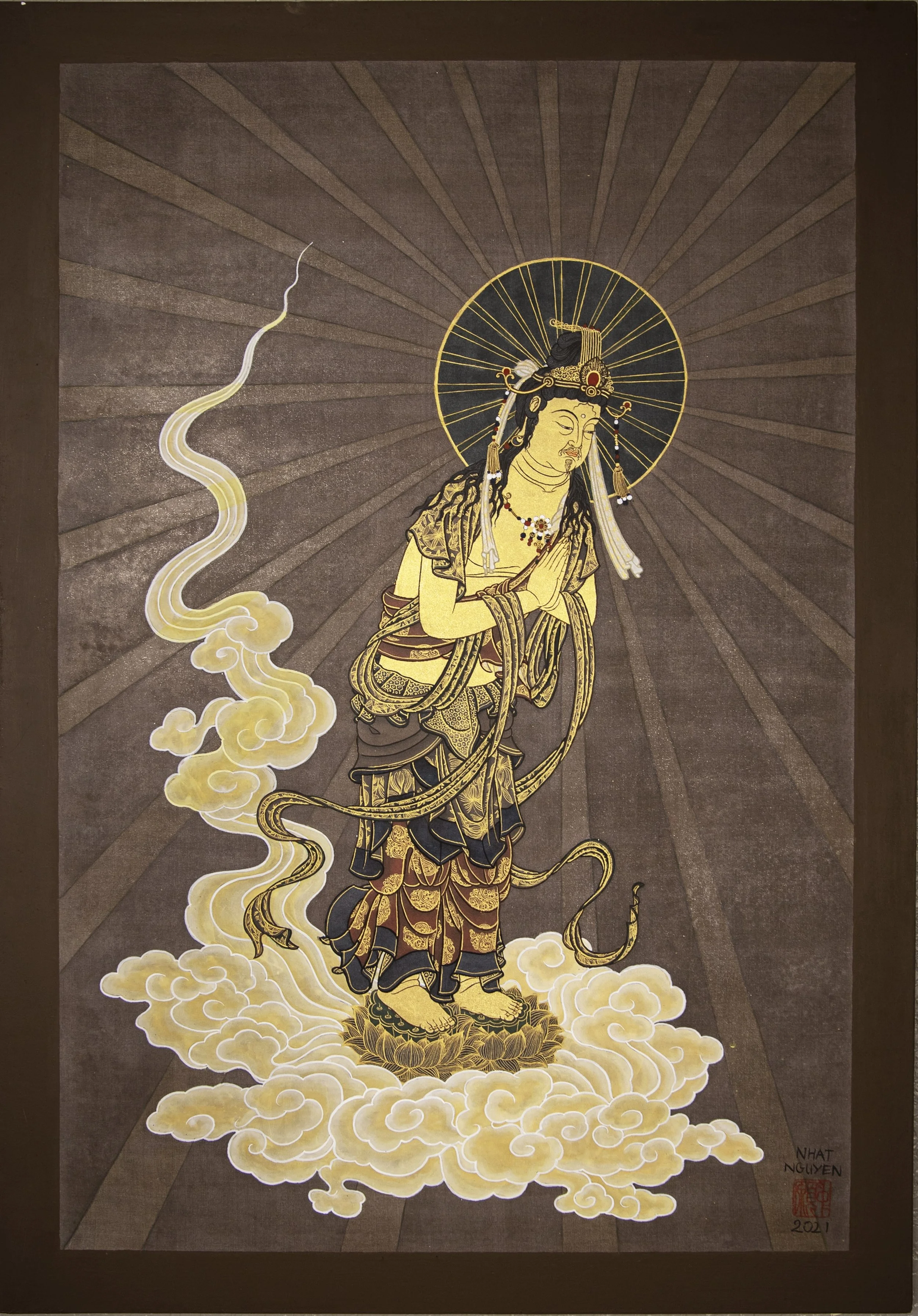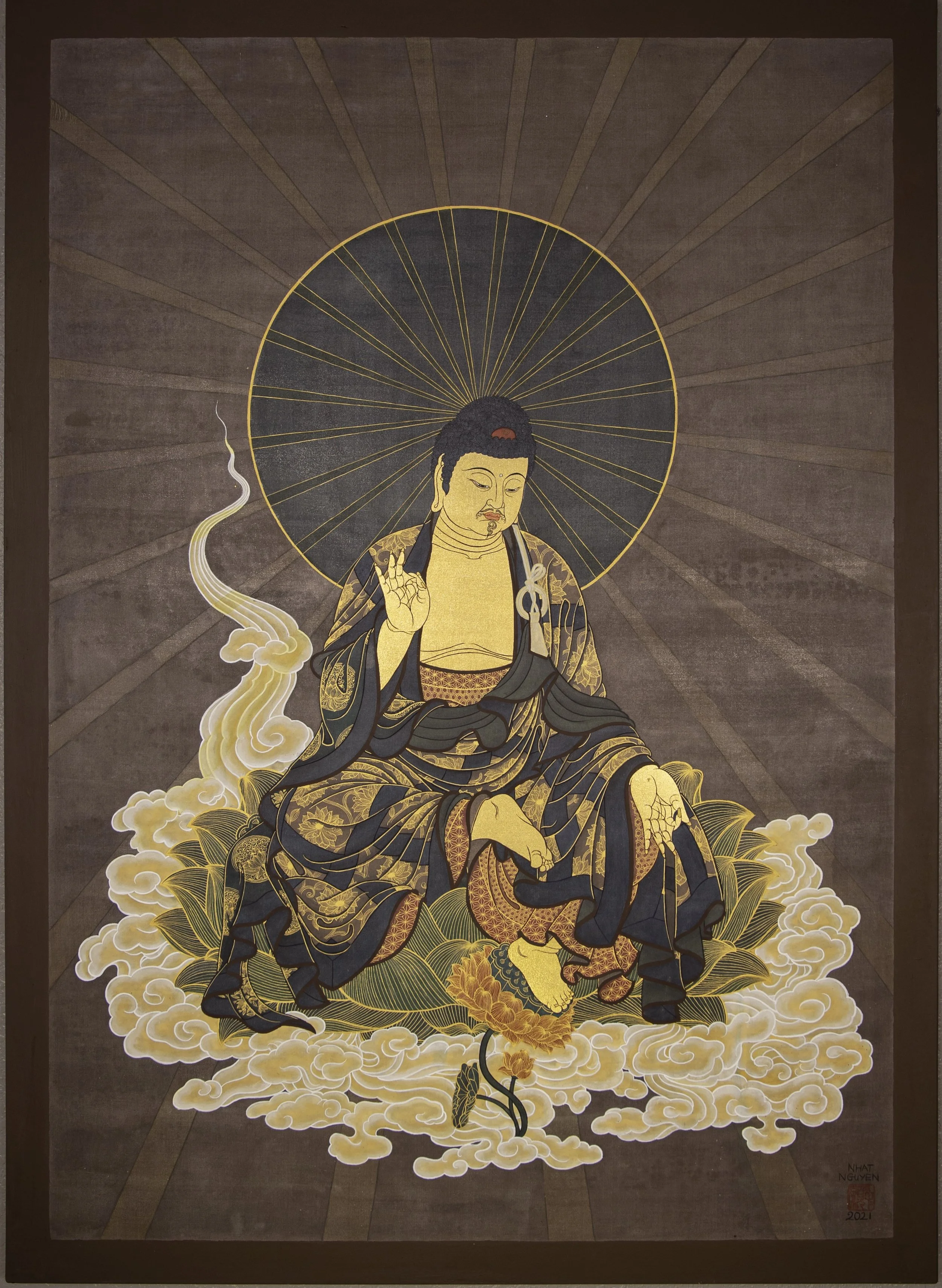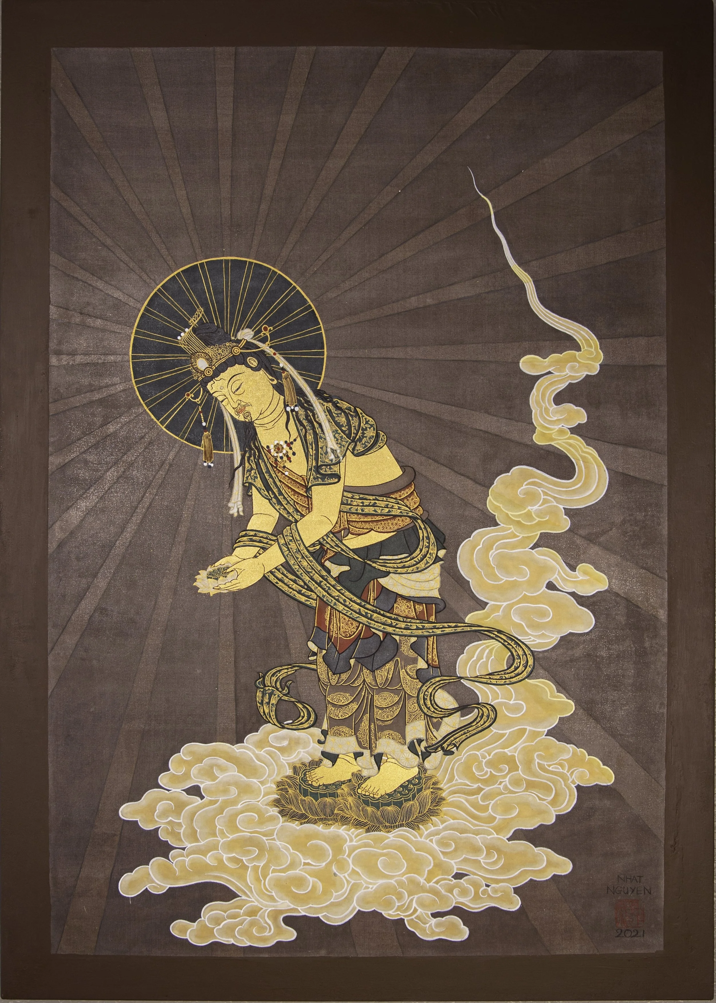 Material: Silk, mineral pigment paint, gold leaf, and ink on silk.