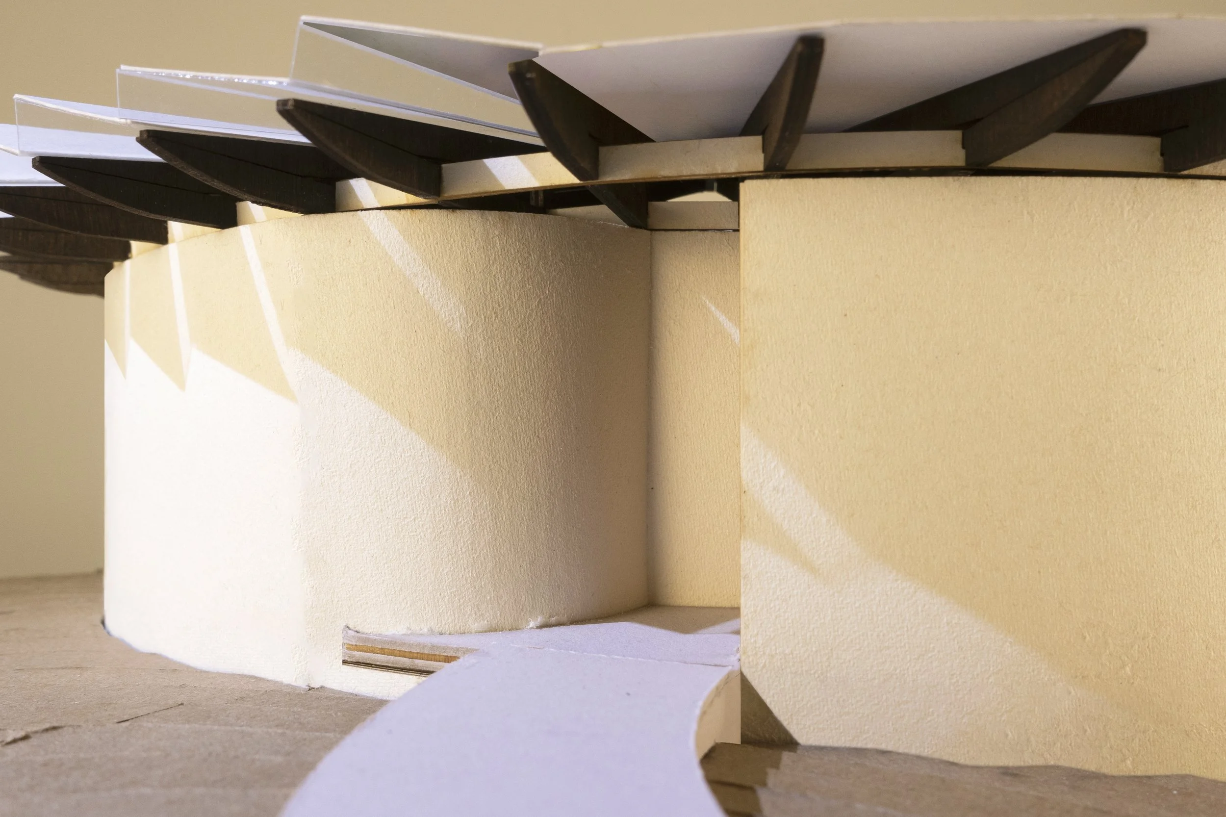 The design is based on this sketch highlighting haft of the ground floor is immersed into the earth which sets the eye level equal to the ground and a vortex structure that emerges from the ground to the roof, creating a radial grid that guides the placement of rafters, beams, and openings in between.